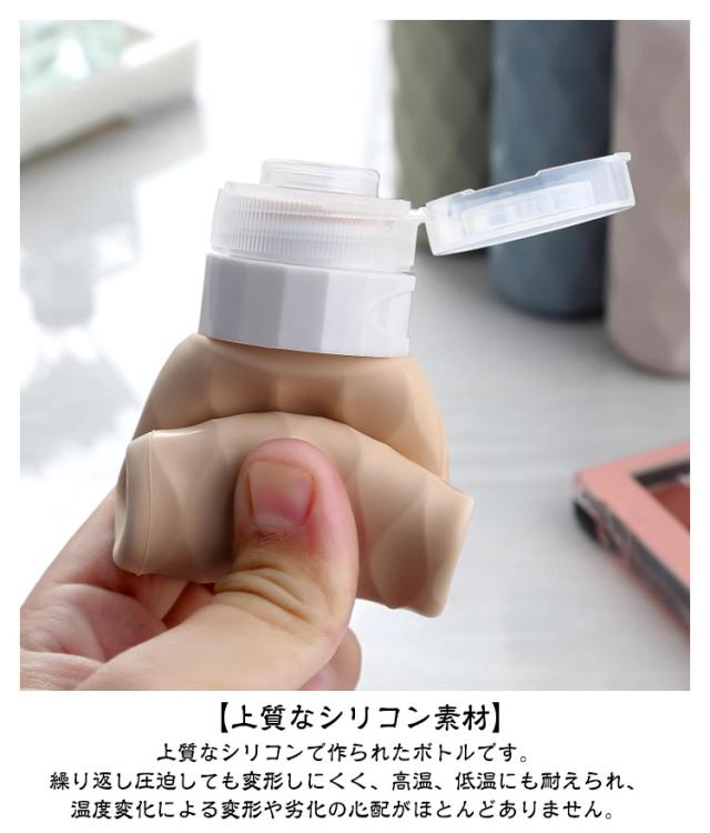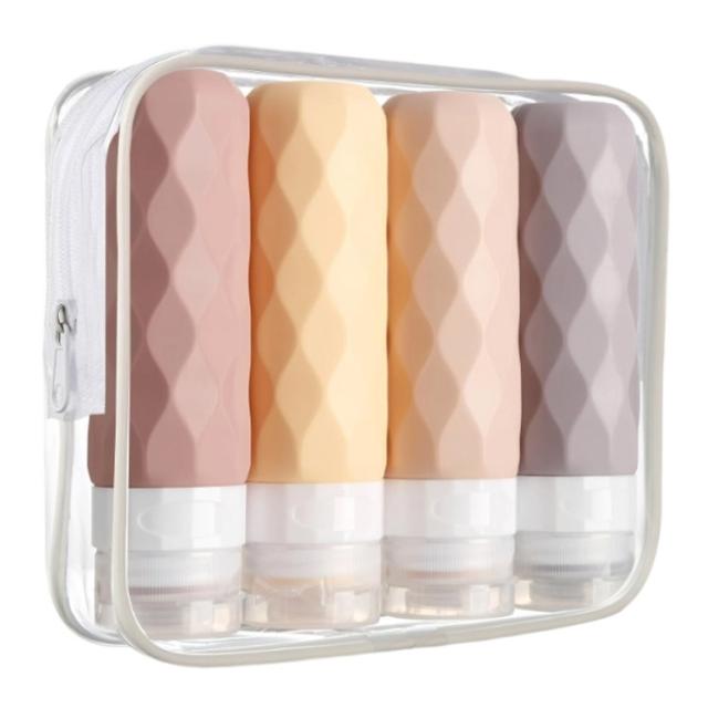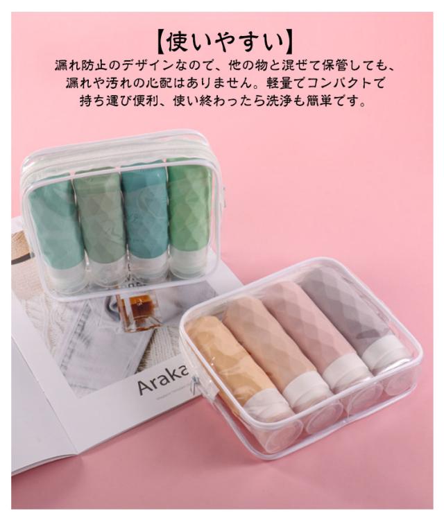 | 詰め替えボトル 4色セット 専用収納パック付き 【飛行機に適用】 容量90mlなので、機内に持ち込むことができます。旅行(海外旅行でも)、出張、ジム、ホットヨガ、銭湯、入院、あらゆるお出かけの場合には最適で、幅広く活躍しています。 【上質なシリコン素材】 上質なシリコンで作られたボトルです。繰り返し圧迫しても変形しにくく、高温、低温にも耐えられ、温度変化による変形や劣化の心配がほとんどありません。 【使いやすい】 漏れ防止のデザインなので、他の物と混ぜて保管しても、漏れや汚れの心配はありません。軽量でコンパクトで持ち運び便利、使い終わったら洗浄も簡単です。 | |