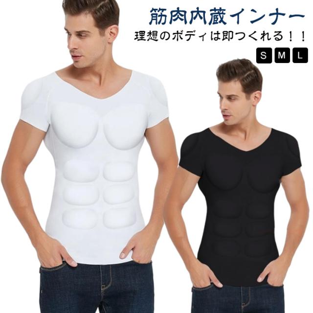 マッチョインナー 半袖 マッチョTシャツ 大胸筋 腹筋タイプ マッチョスーツ シークレット 筋肉内蔵インナー 通気 シームレス Tシャツ 体型補整 マッチョインナー 筋肉Tシャツ M L XL ブラック ホワイト ポリアミド スパンデックス