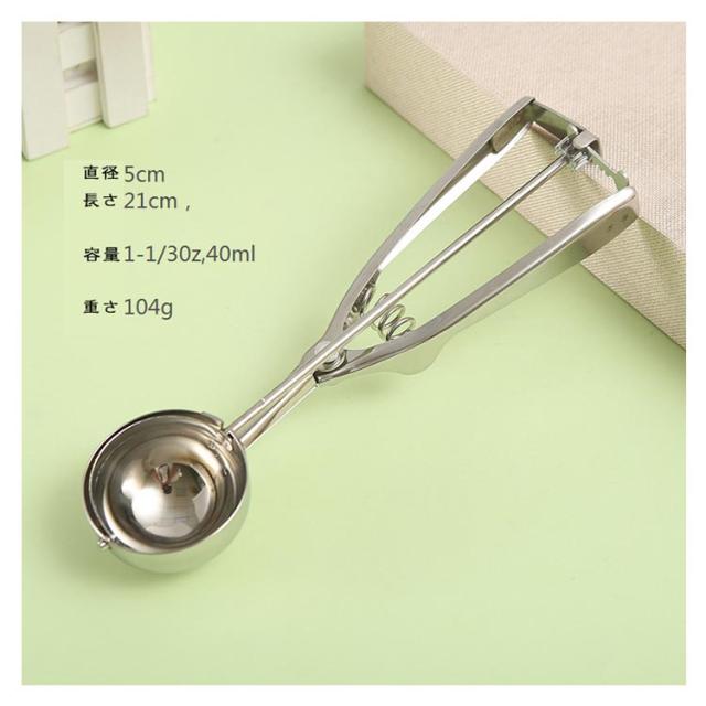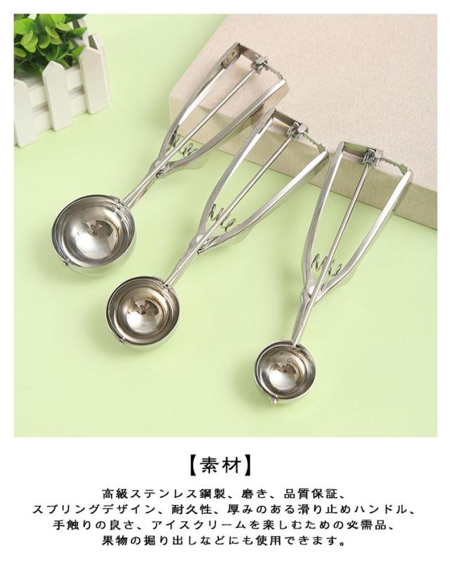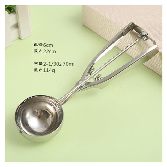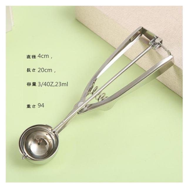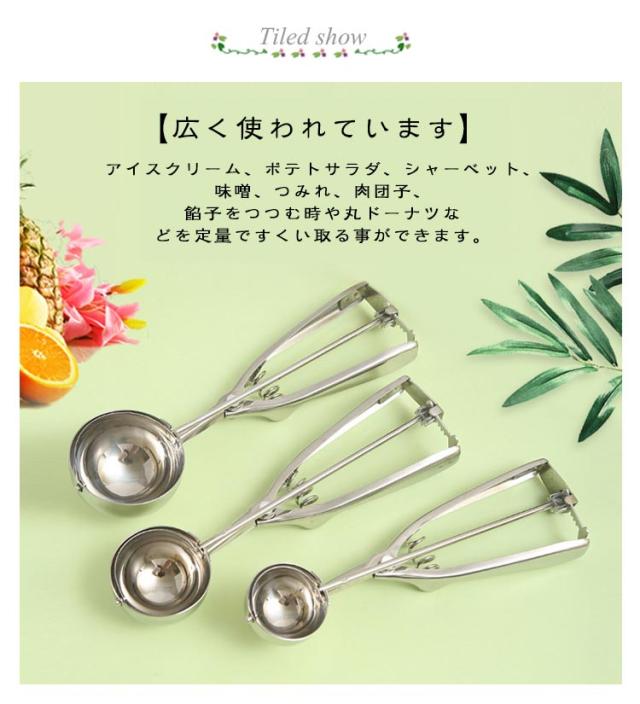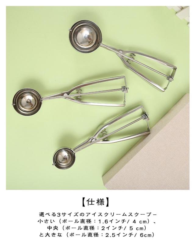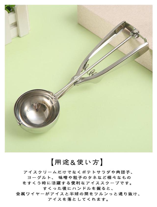 | アイスクリームやポテトサラダの盛り付けに 直径40mm 直径50mm 直径60mm 【素材】高級ステンレス鋼製、磨き、品質保証、スプリングデザイン、耐久性、厚みのある滑り止めハンドル、手触りの良さ、アイスクリームを楽しむための必需品、果物の掘り出しなどにも使用できます。 【仕様】選べる3サイズのアイスクリームスクープ−小さい(ボール直径:1.6インチ/ 4 cm)、中央(ボール直径:2インチ/ 5 cm)と大きな(ボール直径:2.5インチ/ 6cm) 【用途&使い方】アイスクリームだけでなくポテトサラダや肉団子、ヨーグルト、 味噌や餃子のタネなど様々なものをすくう時に活躍する便利なアイススクープです。 すくった後にハンドルを握ると、金属ワイヤーがアイスと半球の間をツルンっと通り抜け、アイスを落としてくれます。 【広く使われています】アイスクリーム、ポテトサラダ、シャーベット、味噌、つみれ、肉団子、餡子をつつむ時や丸ドーナツなどを定量ですくい取る事ができます。お茶、コーヒー、デザート、スイカに使えて、キッチンやレストランでは欠かせないユーティリティです。 | |