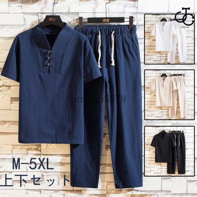 綿麻上下セット セットアップ リネン メンズ ワイドパンツ サルエルパンツ 上下 ルームウェア 半袖 薄手 Tシャツ パンツ 部屋着