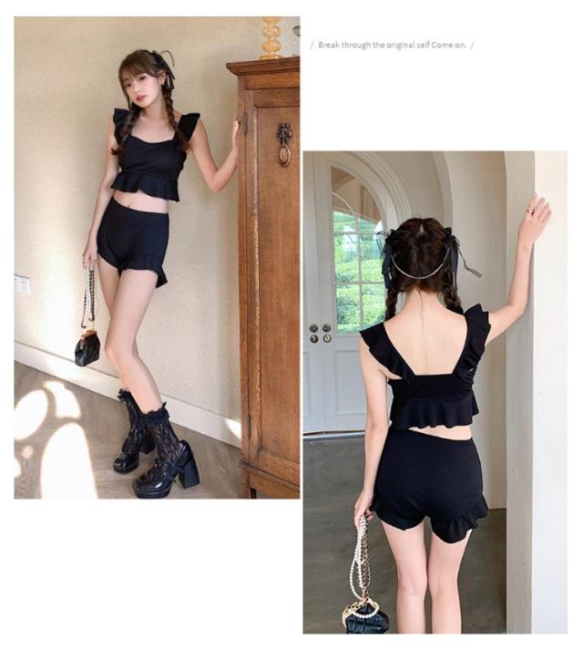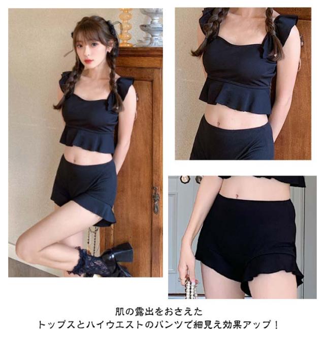 | フレアフリルが可愛いビスチェ風水着。 気になる部分を隠しながら適度な肌見せが可愛い! トップスの裾のフリルがウエストをほっそりと見せてくれる効果があります。ハイウエストパンツの裾もフリルがありますので、気になる腰周りやお腹周りも隠れてスタイルアップ! 肌の露出をおさえたトップスとハイウエストのパンツで細見え効果アップ! | |