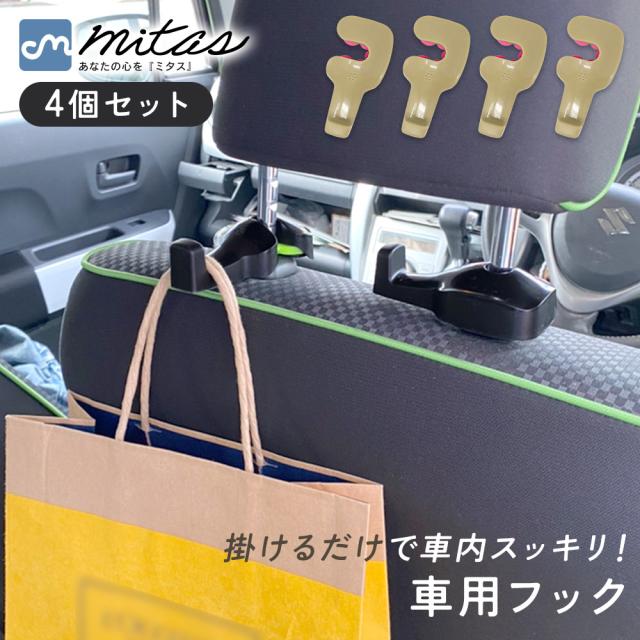 【mitas公式】 車用 フック 4個セット 車用シートフック 引っ掛け カーシート 約8kgまで 荷物フック 運転席 助手席 傘 バッグ ゴミ袋 シート 側面 ヘッドレスト 車内 取り付け 小さい 収納 目立たない コート ハンガー 車用品 車用収納フック シートフック 車載 買い物袋