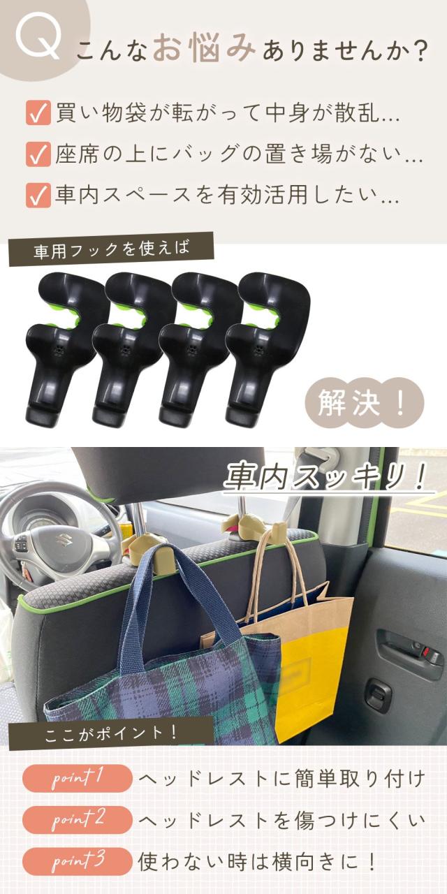 車用/フック/4個セット/車用シートフック/引っ掛け/カーシート/約8kgまで/荷物フック/運転席/助手席/傘/バッグ/ゴミ袋/シート/側面/ヘッドレスト/車内/取り付け/小さい/収納/目立たない/コート/ハンガー/車用品/車用収納フック/シートフック/車載/買い物袋/荷崩れ防止/汎用/車/後部座席/買物袋/レジ袋/便利グッズ/カーアクセ/カー用品/テイクアウト