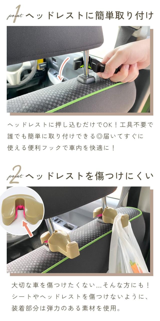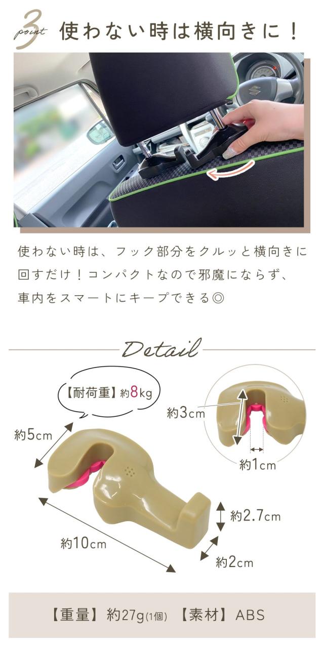 車内のちょっとした収納スペースを確保できるので、コートやハンガーを掛けたり、買い物袋をぶら下げたり、さまざまなシーンで活躍します。