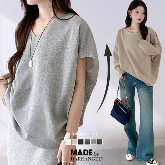 30%OFFクーポン!コクーントップス カットソー Tシャツ 長袖 半袖 トップス レディース Vネック ラウンドネック 半袖 ストレッチ プルオーバー ゆったり 体型カバー 選べる2タイプ 無地 夏 【コクーントップス】 春新作 母の日 ダークエンジェル