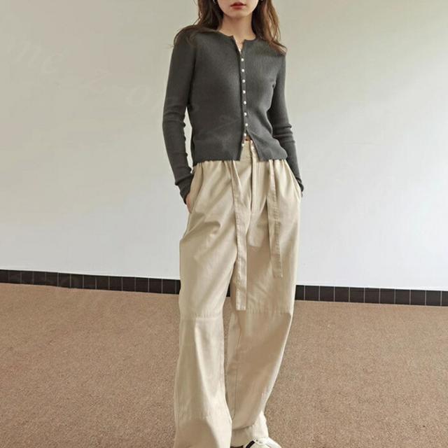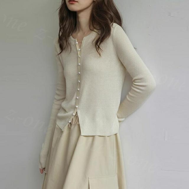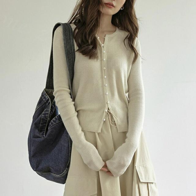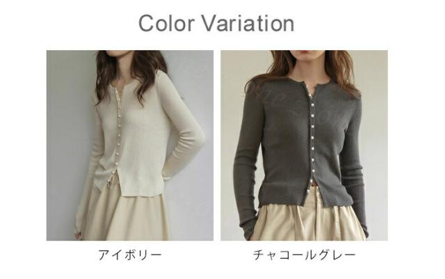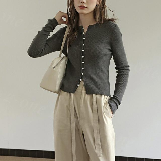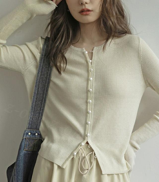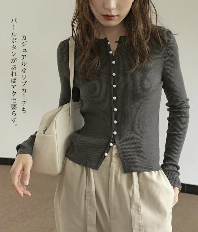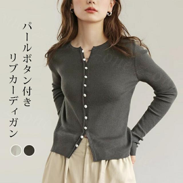 カーディガン レディース リブニット パールボタン ラウンドネック トップス 新作 長袖 リブ きれいめ 肌触り良い 柔らかい パールボタン付きリブカーディガン 可愛い