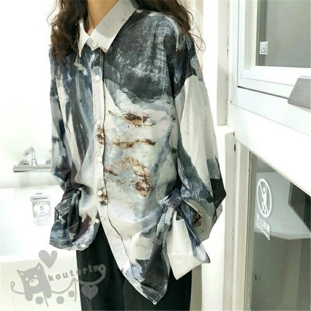 シャツ アート アースカラー 総柄 長袖 ビッグシルエット トップス ダンス 衣装 ヒップホップ コスチューム 韓国ファッション 個性的 服 原宿系 大きいサイズ