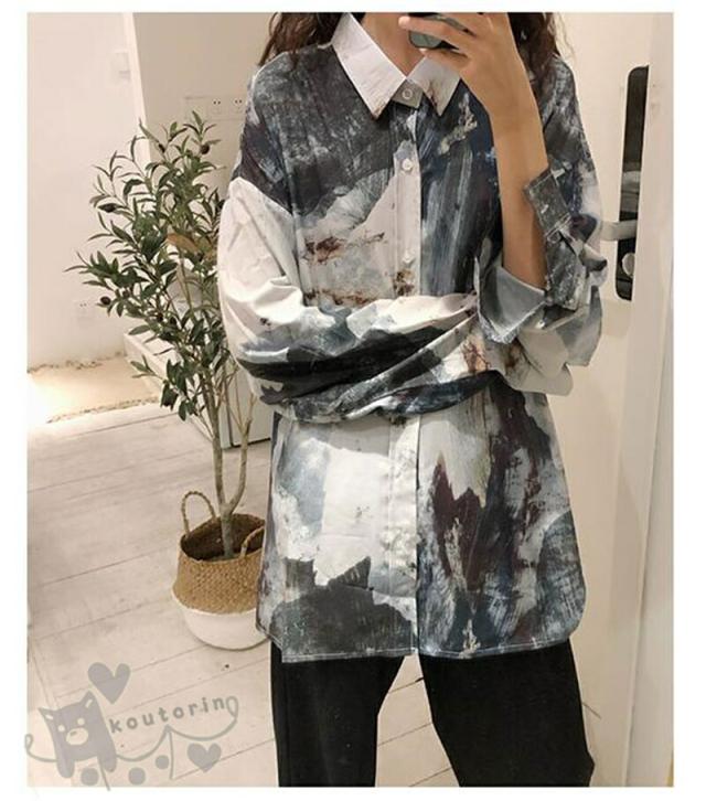 シャツ アート アースカラー 総柄 長 トップス シャツ ブラウス 新登場!