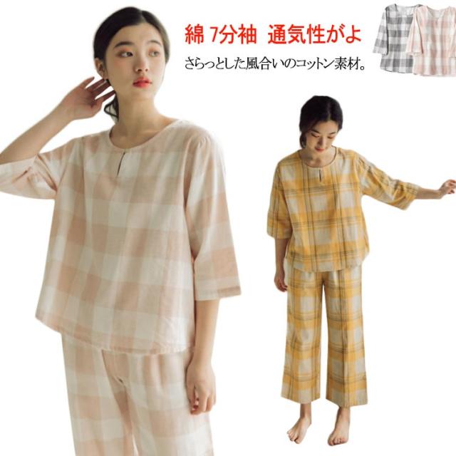 パジャマ レディース ルームウェア 綿 チェック柄 上下セット 夏物 7分袖 ズボン ワイトパンツ ナイトウェア 可愛い 通気性がよく蒸れにくい 柔らかい やさしい 部屋着 母の日 プレ 優れた耐久性