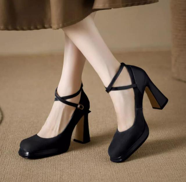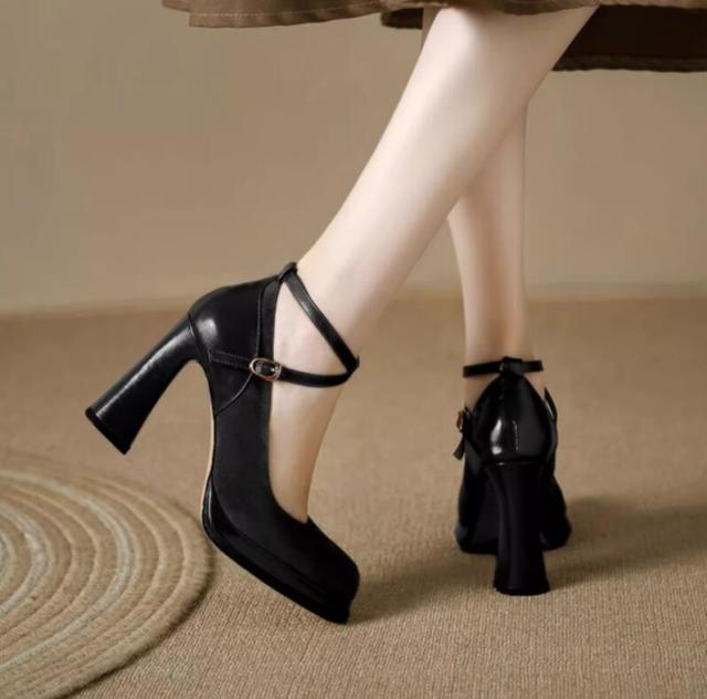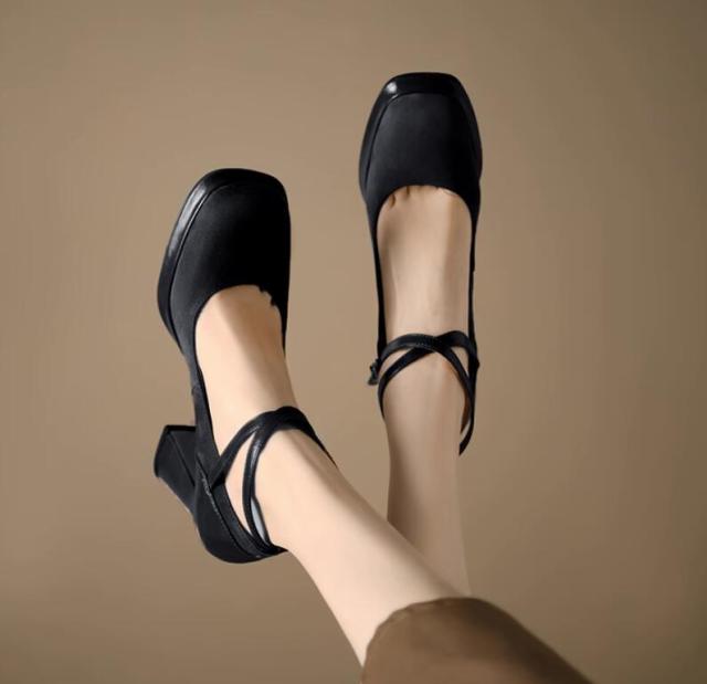 アンクルストラップ付 パンプス レディース スクエアトゥ ハイヒール チャンキーヒール 太ヒール 靴 シューズ シンプル 女子靴 クロスベルトサンダル 疲れにくい 歩きやすい オフ 20代30代40代