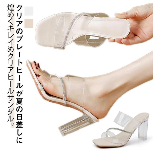 クリアのプレートヒールが夏の日差しに煌めくキレイめクリアヒールサンダル。