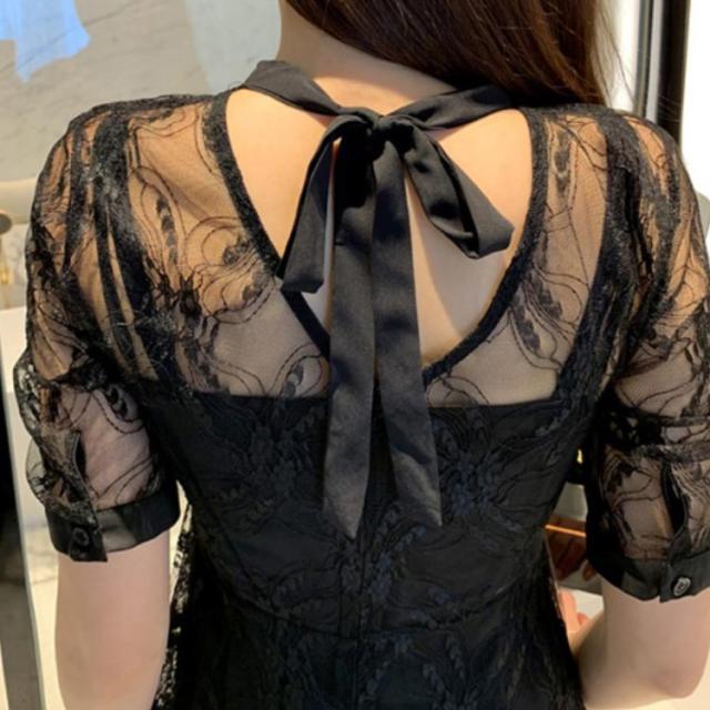 袖と肩ヨークが程よく透け、やや首の詰まったクラシカルな総レースワンピース。