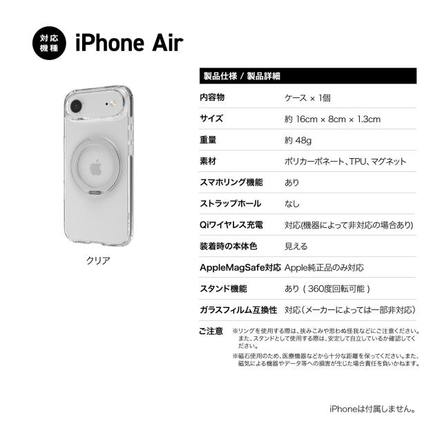 iPhone Air ケース クリア MagSafe 対応 回転 リング スタンド 耐衝撃 スマホケース マグセーフ 透明 頑丈 携帯ケース [ iPhoneAir アイフォンエアー 対応 ] Case RAPTIC Air Stand