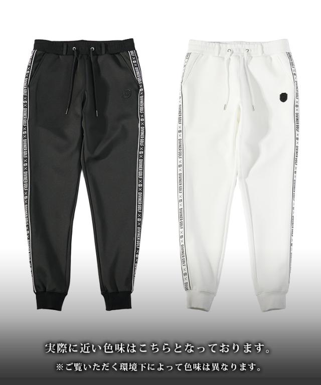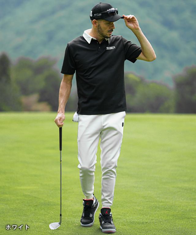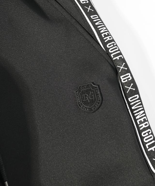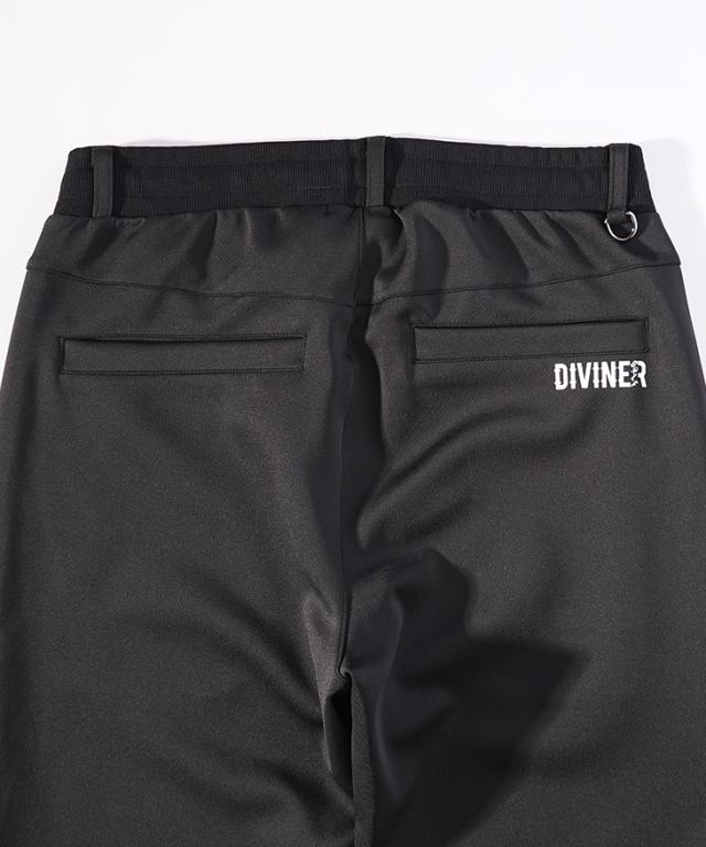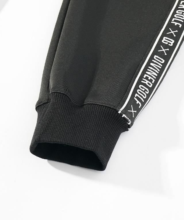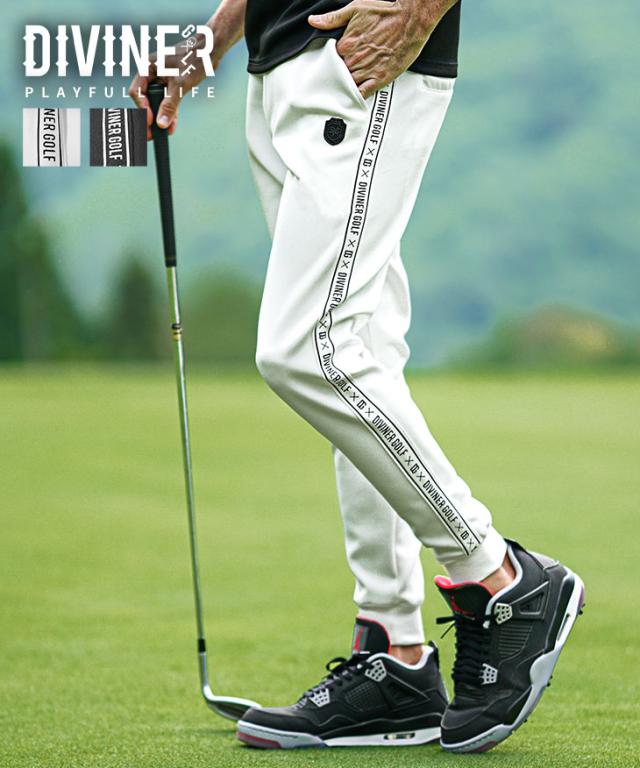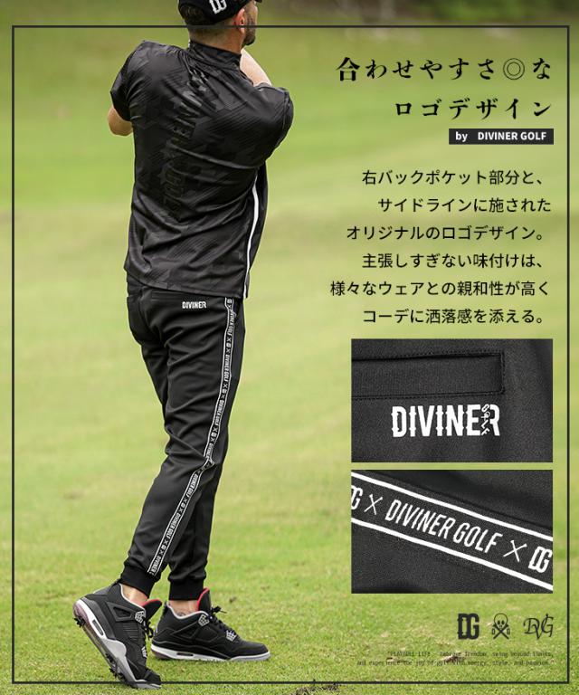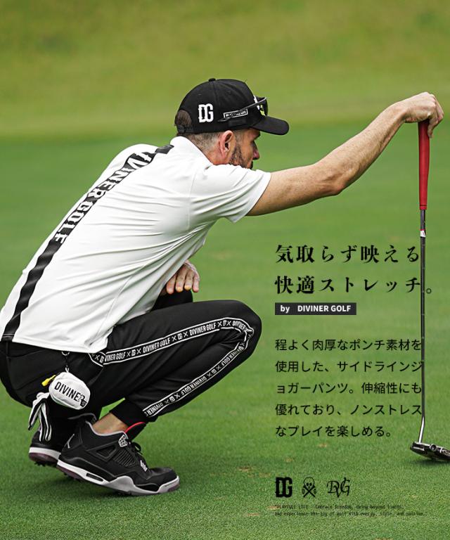 DIVINER GOLF(ディバイナーゴルフ)『サイドロゴラインジョガー』【サイドロゴラインジョガーパンツ】■Design / デザイン程よく細身のシルエットが、スマートな着こなしを演出するジョガーパンツ。両脚にあしらったブランドロゴとアイコンの縦ラインが、ラウンド中のスタイルにさりげないアクセントを加えます。ウエストはゴム+ドローコード仕様でフィット感を調整しやすく、ベルトループ付きでトップスインの着こなしにも対応。前後の大きめポケットは、グローブやスコアカードなどを収納するのにも便利です。軽やかで動きやすい素材感は、スイングや歩行の妨げにならず、春夏のプレーシーンに最適。コース上で映える、クリーンでスポーティな印象を与えてくれる一本です。