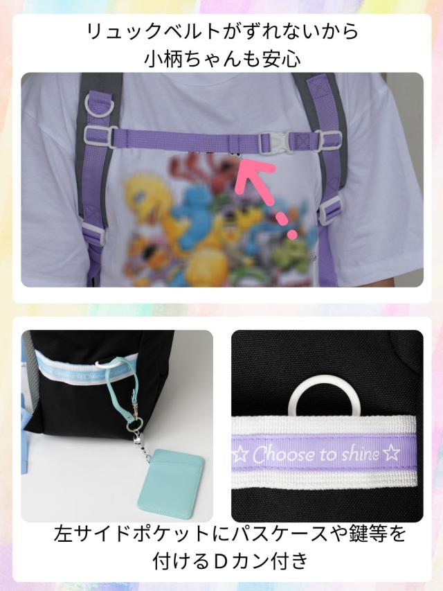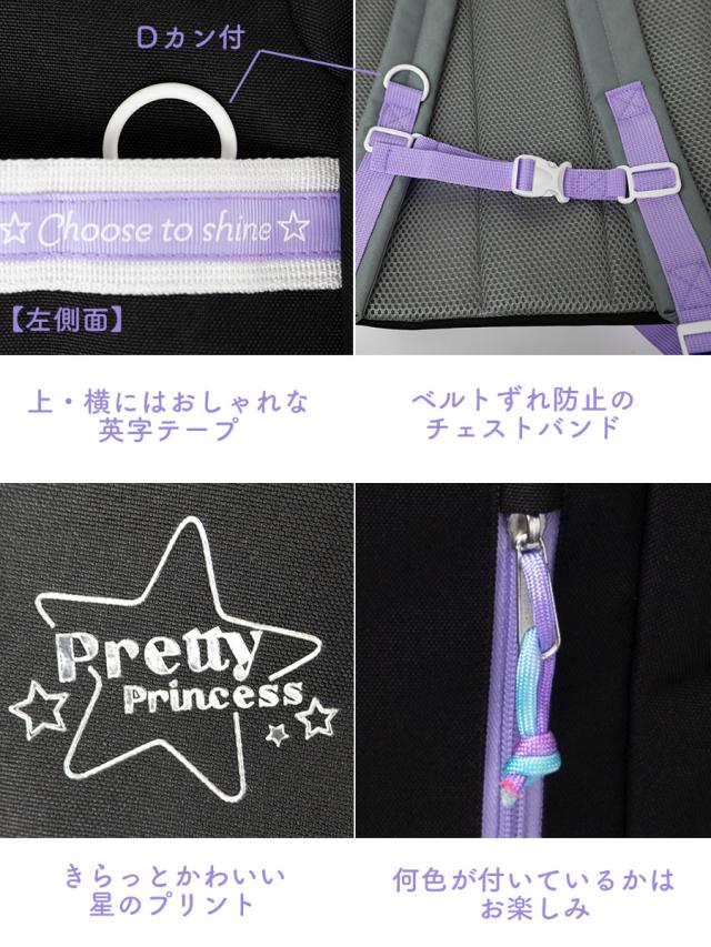 ■ランドセルを卒業した中学年から高学年の小学生にお勧めの大人っぽいけど可愛い!B4ファイル対応サイズのリュックサックです。チェストバンド付きでリュックベルトがずれず、背中もしっかりクッションが入っています。通学・通塾・遠足・旅行などにぴったりです。 ■頂上部がべローンと大きく開くので中を見渡せて出し入れもしやすくなっています。忘れ物のチェックもしやすく、約20Lの大きめですが立体的で使いやすい。ファスナーの引手はグラデーションの紐でできていて、さっと摘まみやすくなっています。※引手のお色目はお選びいただけません。 ■左のサイドポケットとリュックベルトにDカンが付いています。防犯ブザーやパスケース、鍵などを付けることができます。 ■なりたい自分には、いつだって、誰だってなれる。『好きなものはぜんぶ欲しい』と自分に素直になっていい。『お気に入り』がいつもそばにあれば、毎日がきっと特別になる。子供たちの夢と願いを叶える『好き』がたくさん詰まったバッグブランド Pretty Princess プリティプリンセスの商品です。 ■※仕様・タグデザイン等が予告なく変更になる場合がございます。あらかじめご了承ください。 |