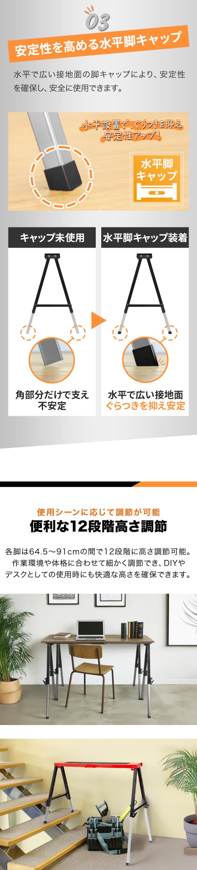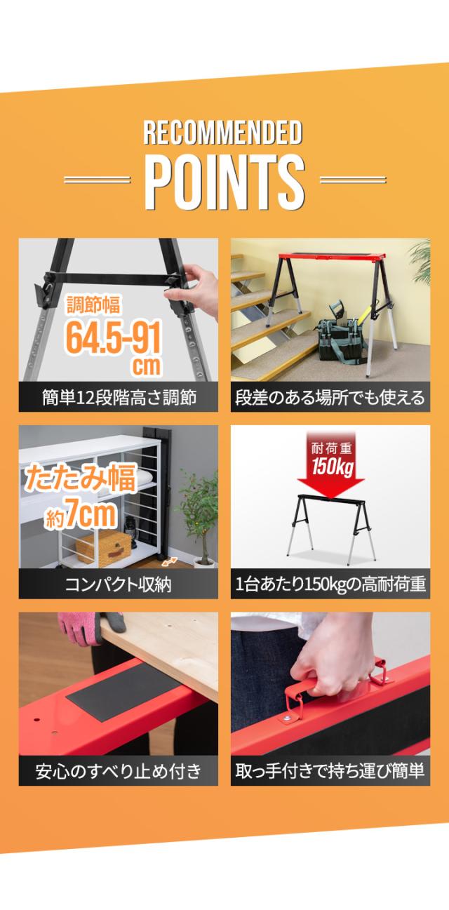 FIELDOOR ソーホース 作業台 2脚セット 2台1組 折りたたみ 高さ調節 12段階 64.5cm〜91cm 耐荷重150kg メタル スチール製 馬脚 DIY 日曜大工 木工 簡易作業台 工作台 作業馬 作業机 デスク ワークテーブル テーブル脚 2本組 ※脚のみ 1年保証 送料無料