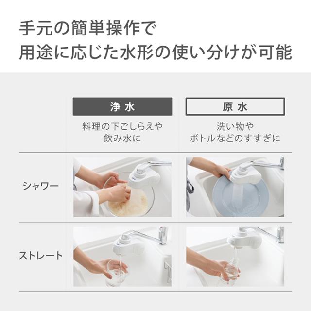 先端の「プッシュボタン」で浄水/原水の切替が、 「レバー」のスライドでストレート/シャワーの切替が可能です。
