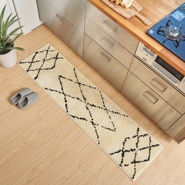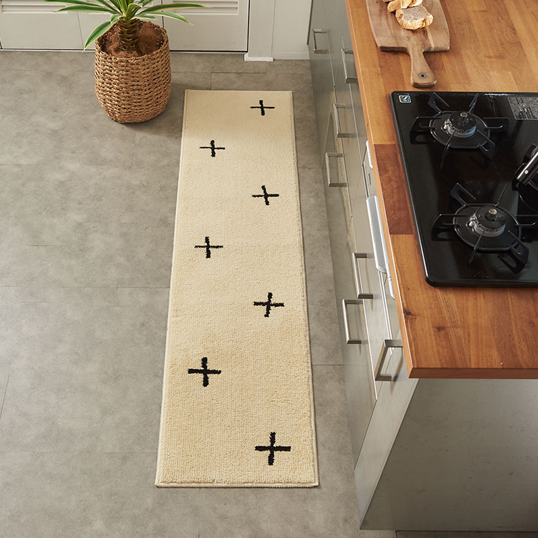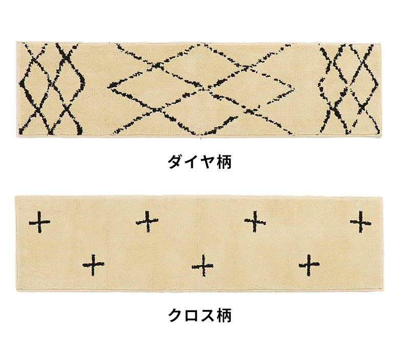 これだけの機能性を持ちながら、しかもおしゃれ!フリーハンドで描かれたような模様で、ベニオワレンラグ風ダイヤ柄とクロス柄の2パターンからお選びいただけます。ベーシックカラーでインテリアに馴染みやすいので、デザインマット初心者の方にもおすすめです。