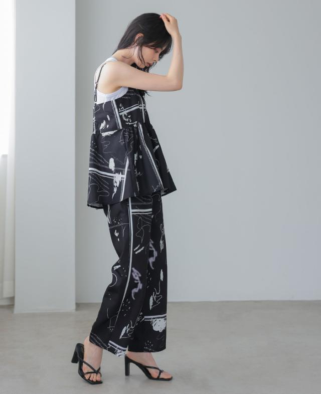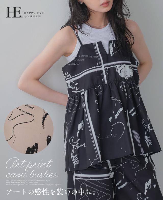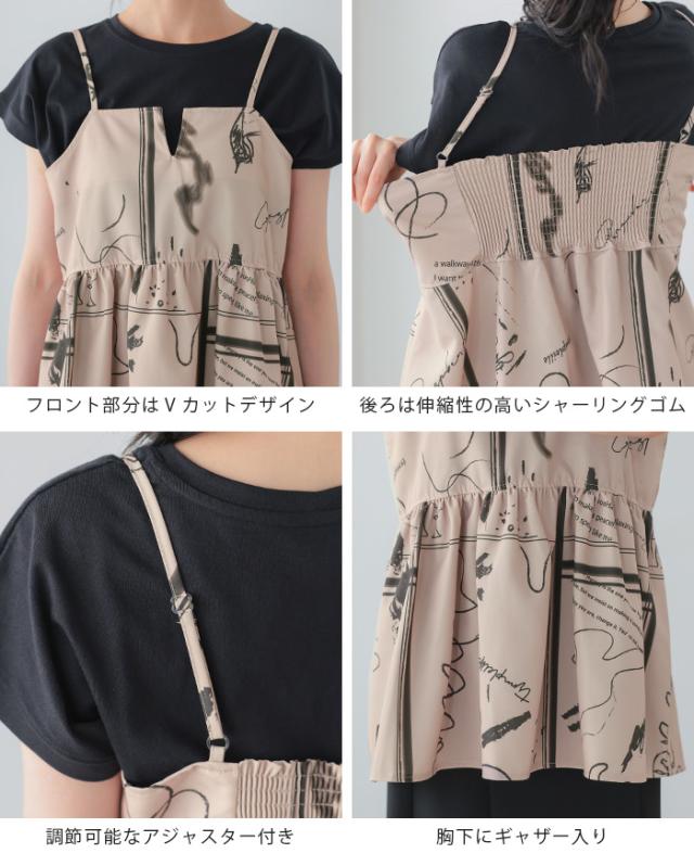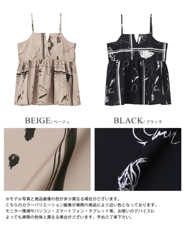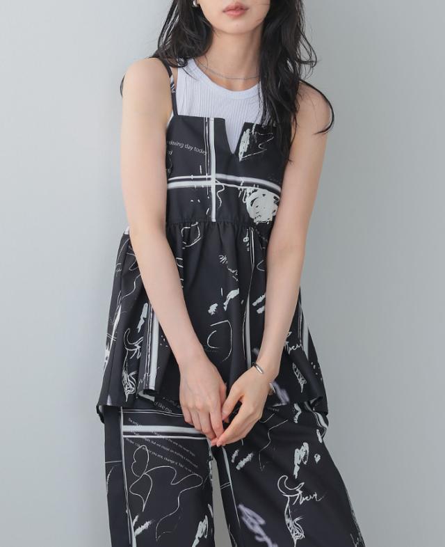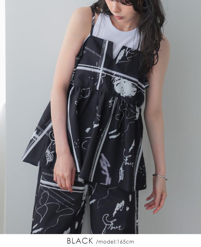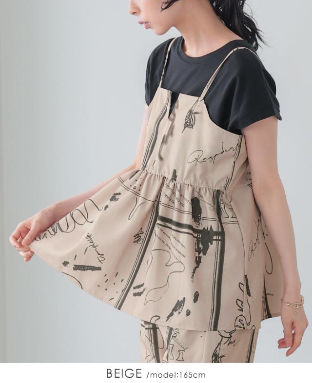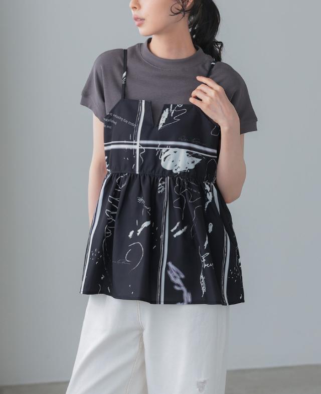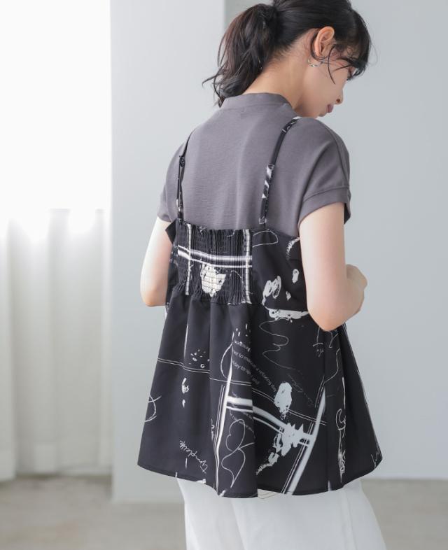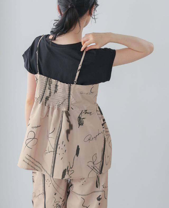 英字プリントキャミソール キャミ ベスト ギャザー モノトーン【メール便1点まで】[M便 1/1]
