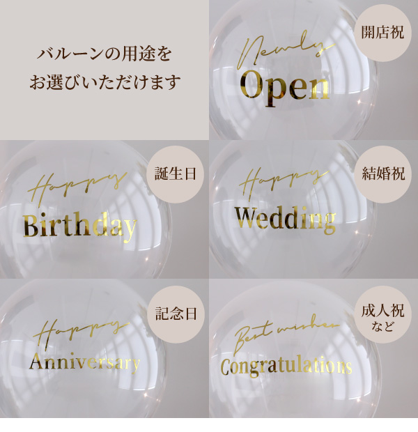 | 用途 | 開店祝い 周年祝い 開院祝い 開業祝い オープン祝い 新事務所設立 祝電 バルーン電報 |