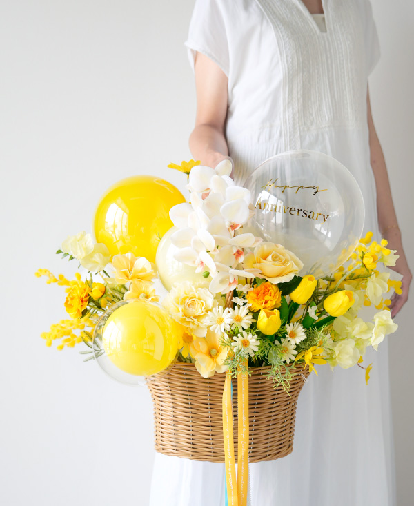 た、花を主役にした新感覚のバルーンアレンジ。縁起の良い花言葉「幸福が飛んでくる」で知られる胡蝶蘭をワンポイントに、色とりどりの花々が華やかに組み合わされた、ボリューム感あるアレンジです。