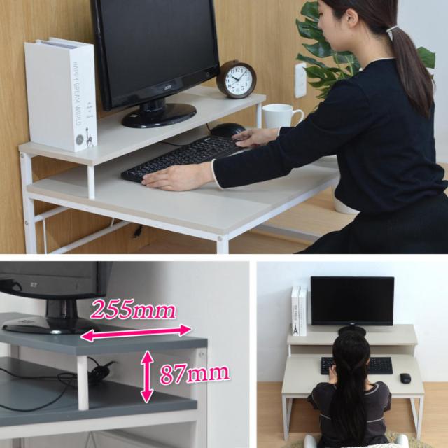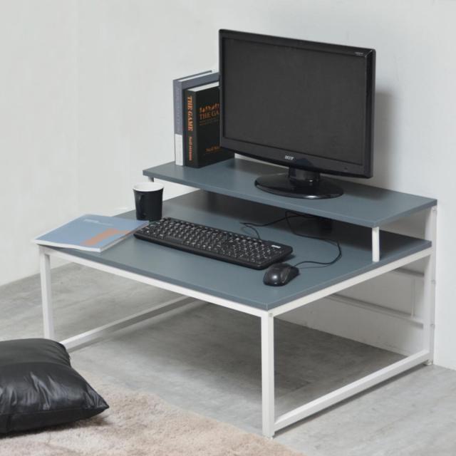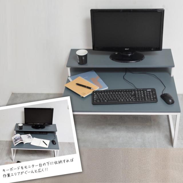 リラックスした状態で作業できるモニター台付きのPCデスクです。ロータイプのシンプルな設計でモニター台の下スペースが広々としており、デスクワークなども捗ります。