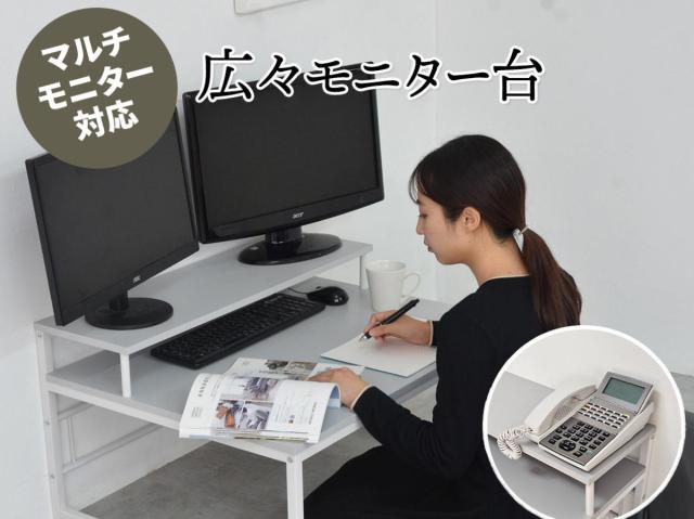 モニター台は奥行きが約23cmあり、電話が置けるのでリモートワークにもピッタリです。両端に何もないフラットな台のため、縁に当たることなくモニターを複数並べることが可能です。