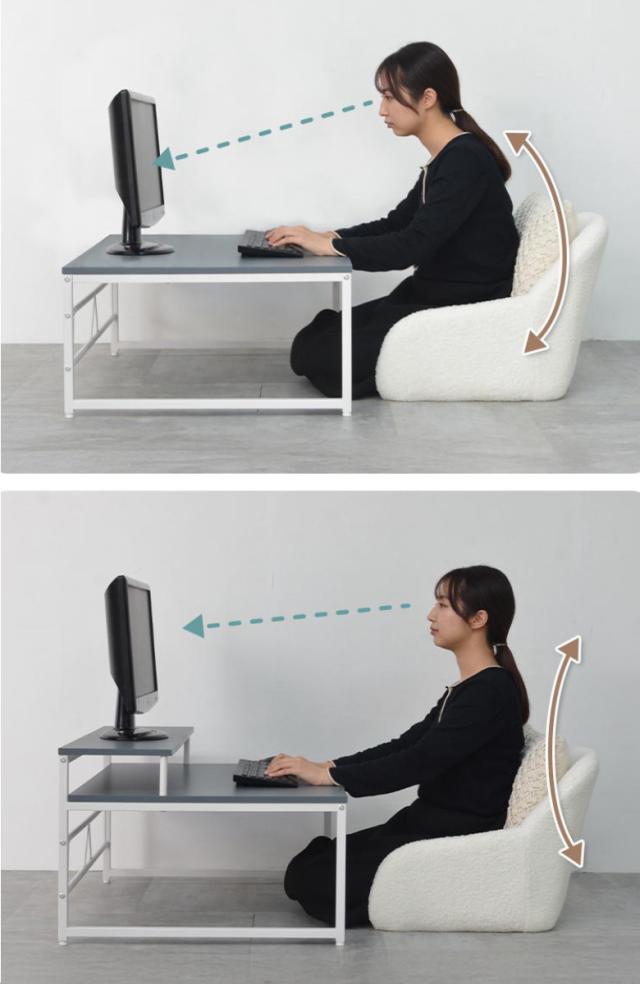 モニターの位置が高くなることにより視線が上がり自然と背筋が伸びます。正しい姿勢を保つことができれば肩や腰の負担を軽減します。疲れにくくラクに作業ができます。