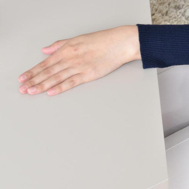 MDF合板にメラミン樹脂の天板は強くて丈夫です。硬度が高いので書きものする時にも最適です。サラサラした表面で手触りも優しいです。セミマットな仕上がりで落ち着いた雰囲気があります。
