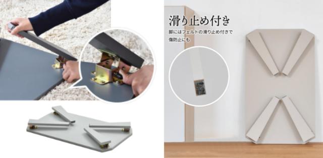 | 簡単に脚をたためる 折れ脚金具の突起を抑えてたためます。勝手に脚が折れることがなく安心です。 | 滑り止め付き 脚にはフェルトの滑り止めが付いており、床のキズつき防止にもなります。 |