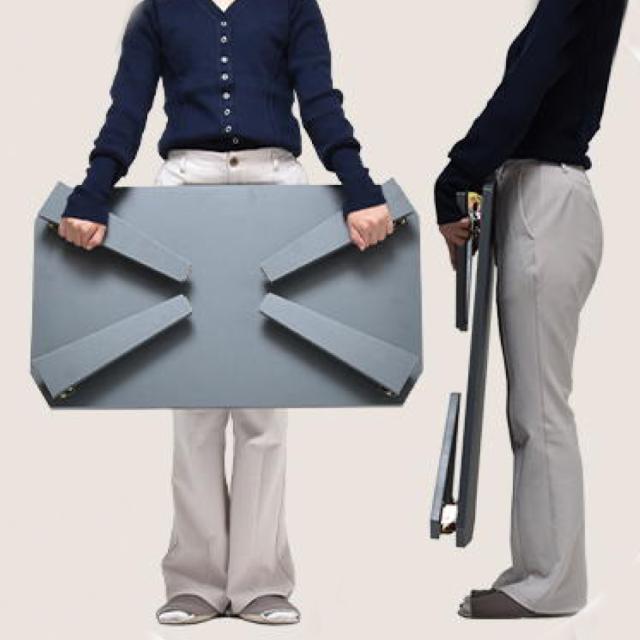 角をカットして八角形に仕上げた天板から、大胆に伸びる脚部は下に向かうほど徐々に細くなっています。畳んだときは表から脚部が見えず、広げるとそのままスッと伸びる脚がスタイリッシュです。