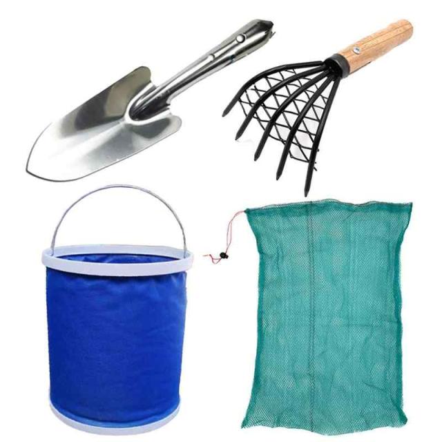 現地ですぐにお使いいただける潮干狩り4点セット(折り畳みバケツ・網付き熊手・シャベル・網袋)です。