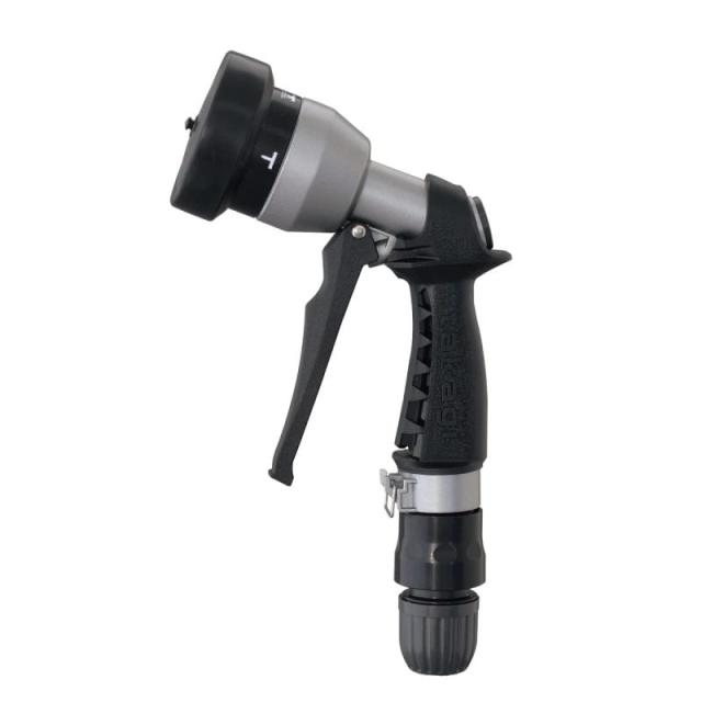 金属の頑丈なノズルでありながら、ラバーグリップで手にフィットする使い心地にもこだわったタフギアメタルノズル。レバーを握ると連動してストッパーがロックされ、通水中の手への負担を軽減。普通ホース(内径12-15mm/外径21mm)に対応。