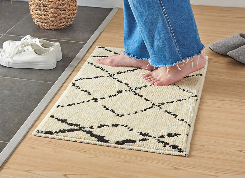 約45×70cmのマットは、玄関や洗面所、脱衣所に使いやすいサイズ感。お手入れが簡単な短めの毛足ながら、サラサラとした心地いい肌触り。床暖房&ホットカーペットに対応しているので、オールシーズン快適にお使いいただけます。日々の暮らしを快適に変えてくれる、嬉しい機能が備わったデザインマットです。