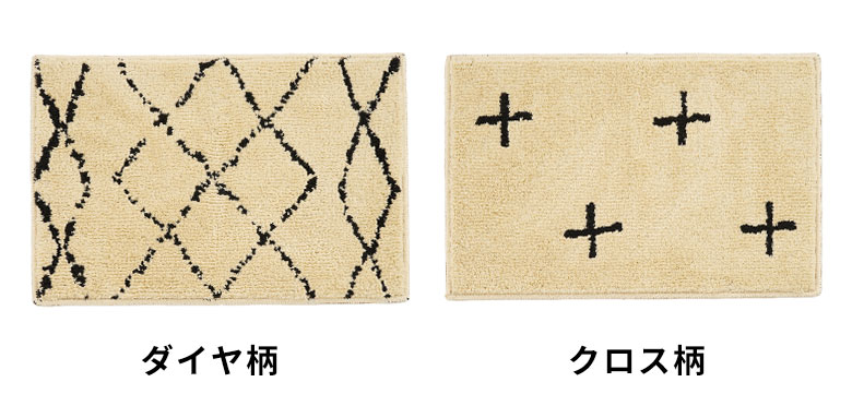 これだけの機能性を持ちながら、しかもおしゃれ!フリーハンドで描かれたような模様で、ベニオワレンラグ風ダイヤ柄とクロス柄の2パターンからお選びいただけます。ベーシックカラーでインテリアに馴染みやすいので、デザインマット初心者の方にもおすすめです。
