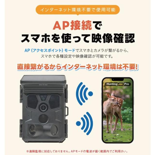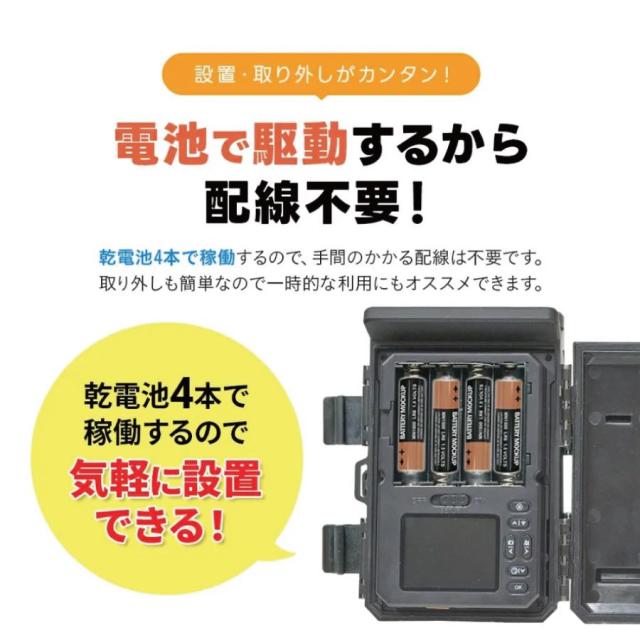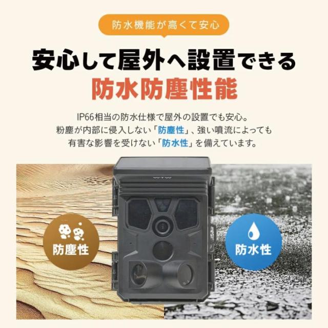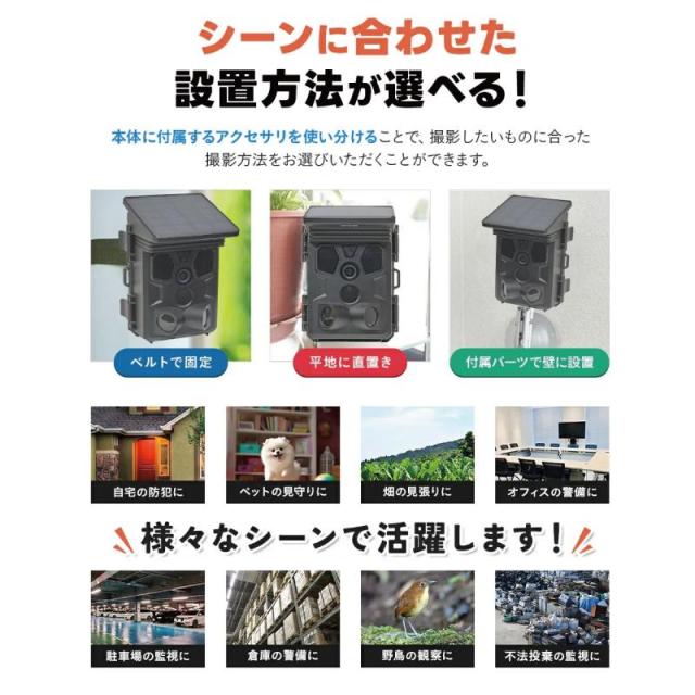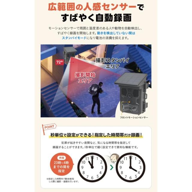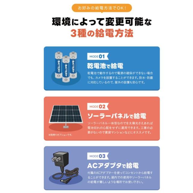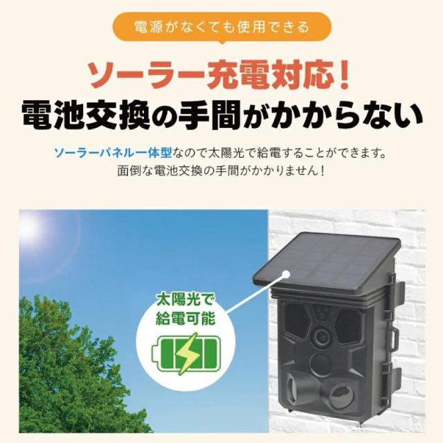 小型ソーラーパネルがカメラ頭頂に一体化しており、カメラ内部にバッテリーが入っているので、<電池も入れずに使用することも可能です