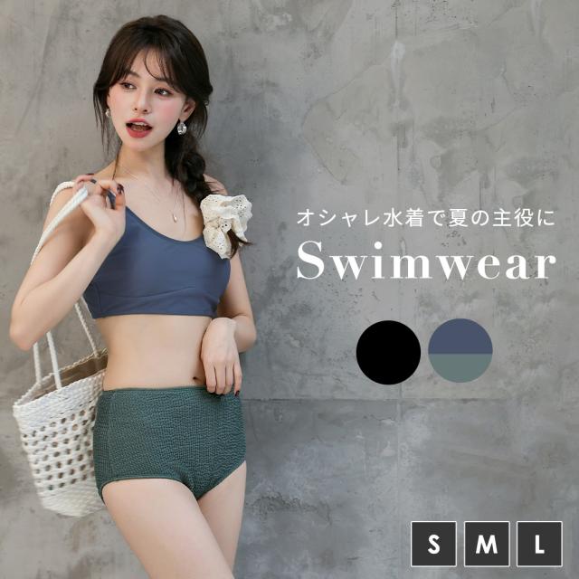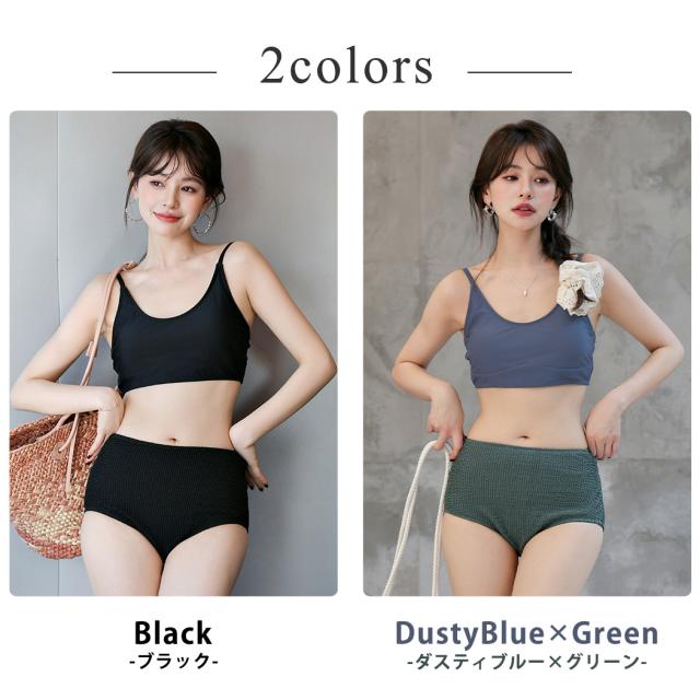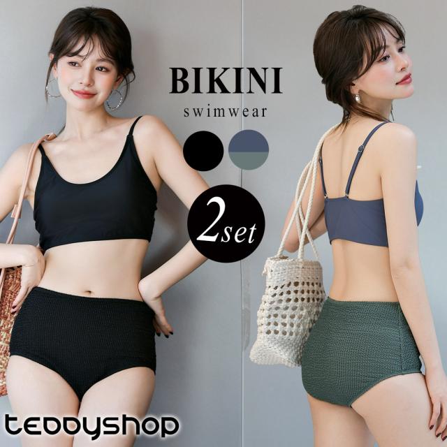 夏新作 ビキニ 水着 レディース キャミキニ ハイウエスト ショーツ 2点セット 異素材 ストライプ調 ワッシャー加工風 ノンワイヤー パット付き 小胸 バスト 盛れる 肩ひも調節 アジャスター 脚長効果 お腹 カバーアップ 無地 黒 バイカラー