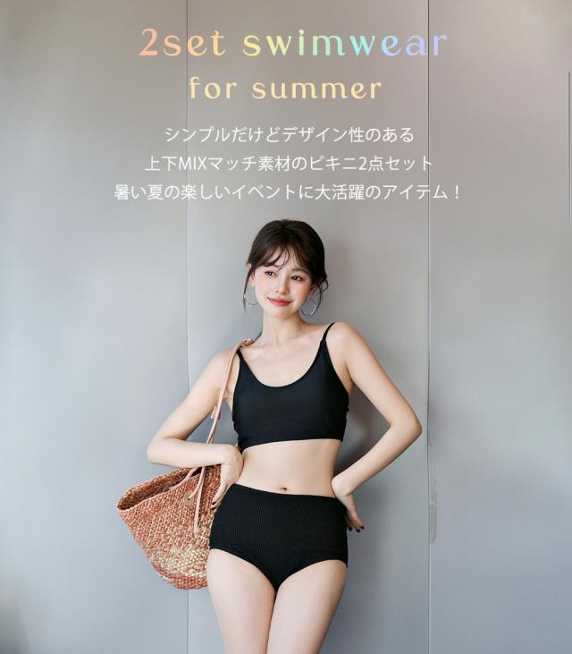 シンプルだけどデザイン性のある上下MIXマッチ素材のビキニ2点セット