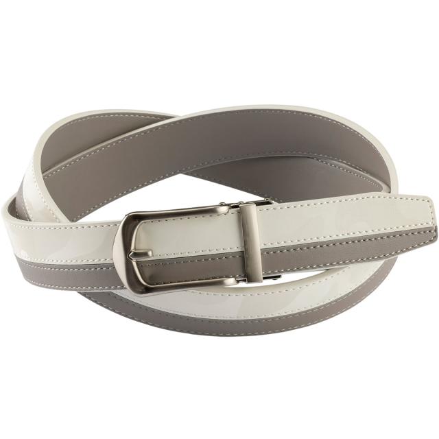 ベルト穴が無く、サイズ調整が細かくできる。カモ柄と無地の切り返しが特徴のベルト。