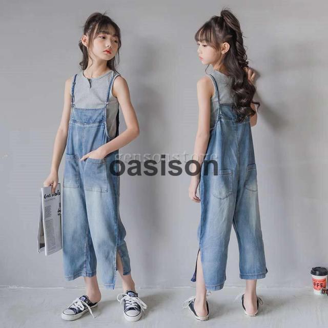 サロペット オーバーオール デニム ロングパンツ キッズ ジュニア 子供服 女の子 スリット ヴィンテージ加工 ゆったり ロンパース ジーンズ 春夏 薄手 ボトムス