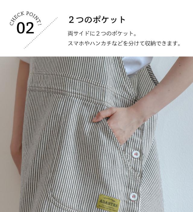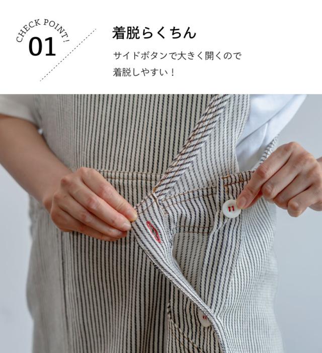 デニムライクな綿素材のサロペットエプロン。どんなテイストの雰囲気でも合わせやすいマルチなデザイン◎ポケット部分ににワンポイントの織ネームがアクセント。 脇ボタンで着脱簡単で、お料理でも作業でも使えるエプロンです。肩の幅が広いのでエプロンがずり落ちません。