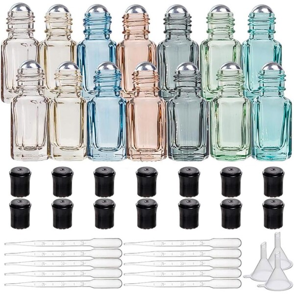 BENECREAT 14個3mlロールオンアロマボトル カラフルガラスボトル 注ぎツール付 アロマオイル用 精油 ミニボトル コスメ小分けボトル