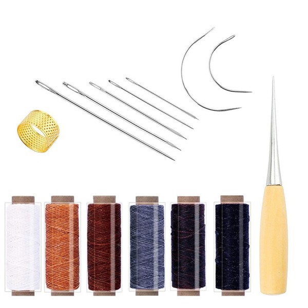 セット内容:蝋引き糸6、 手縫い針7、 千枚通し1、 シンブル(指貫)1。