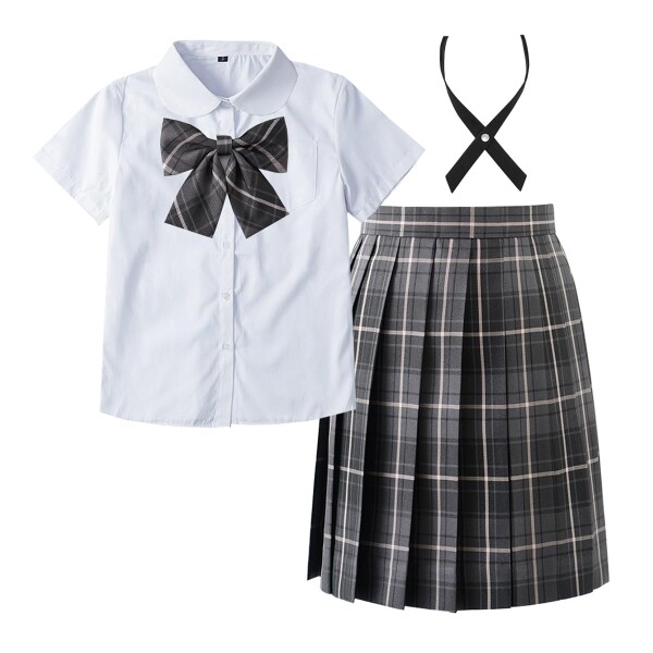 (SYRHSYB) コスプレ 制服 セット jkスカート 丈48cm 4点セット 女子学生服 上下セット 半袖 丸襟 長袖 白いシャツ+蝶結び+クロスタイ+チェックスカート 写真撮影 パーティー衣装 遊園地