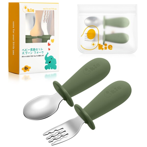 Qkie スプーン フォーク セット 離乳食 スプーン 自分で食べる ベビー スプーンフォーク 収納袋付き 8ヵ月以上へ (抹茶)