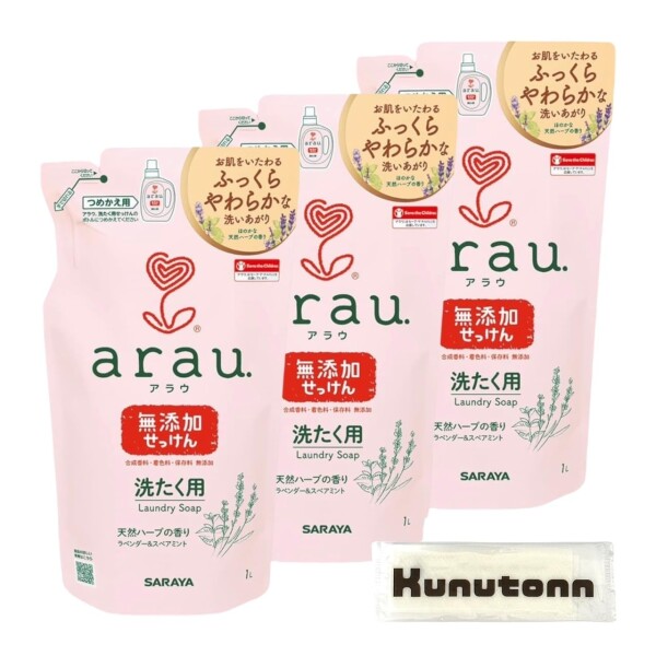 アラウ 洗たく用せっけん 洗濯洗剤 天然ハーブの香り 詰め替え 1000ml 3個セット + Kunutonnオリジナルロゴ入りhおしぼり付