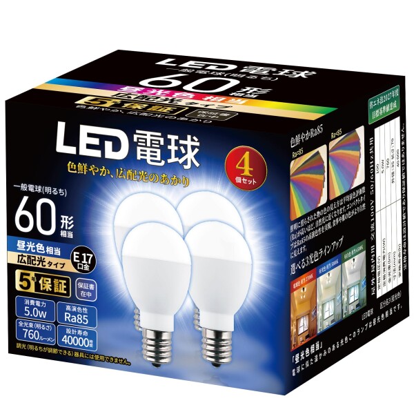 ミニクリプトン型 LED電球 口金直径17mm 電球60W形相当 昼光色相当(5W) 小形電球・広配光タイプ「ネック部 : スリムタイプ」 断熱材施工器具対応 密閉器具対応 4個セット (4個 昼光色)