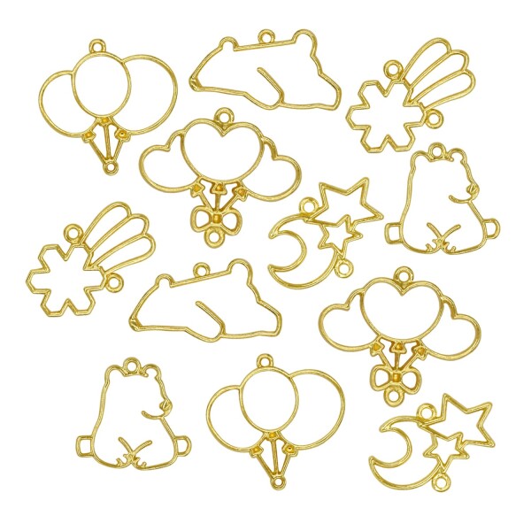 ■レジンクラフトに最適のUVレジン空枠で、6種12個の大量セットです。 素材:合金 カラー:ゴールド 数量:12個(6種×2個) サイズ:画像にご参考ください(