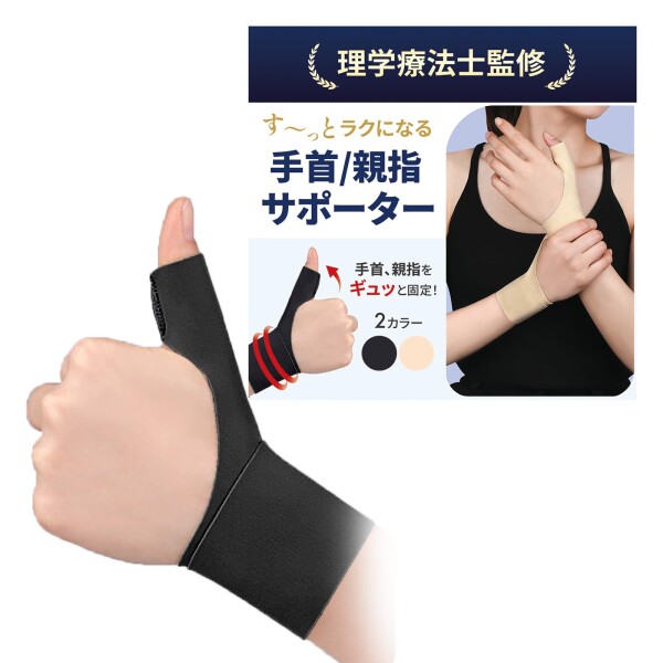 【理学療法士監修】腱鞘炎、バネ指などの育児や家事、パソコン作業などで起こる痛みに対して、親指から手首を優しく固定して、過度な動きを制限し負担を軽減させるサポーターです。