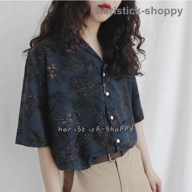 アロハシャツ レディース トップス シャツ ブラウス シャツブラウス 半袖 五分袖 オープンカラーシャツ 開襟シャツ 花柄 ボタニカル柄 総柄 柄シャツ ゆったり 体型カバー カジュアル おしゃれ フリーサイズ 夏 ネイビー ブルー 20代 30代 40代